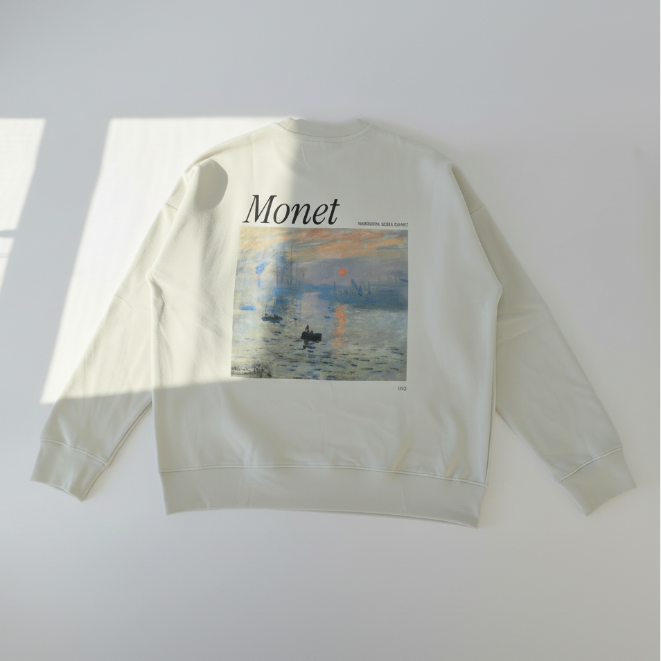 Monet's groundbreaking Impression, Sunrise - a hazy harbor in glowing oranges and blues, and the spark of a movement - spreads across the back of your crewneck in soft detail. Cozy cotton-polyester blend delivers warmth without weight, perfect for layering or lounging. Ribbed trim, relaxed fit, built to handle daily life while turning heads.