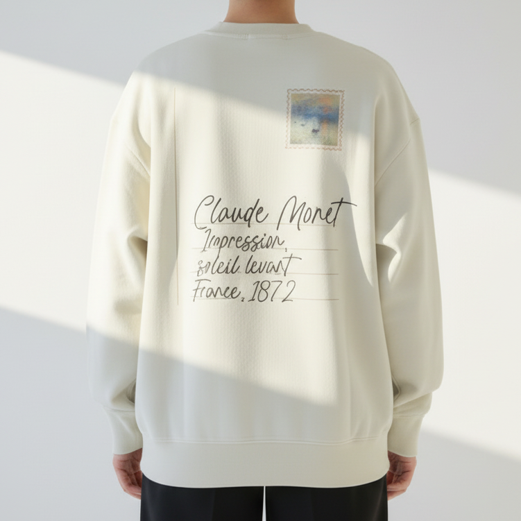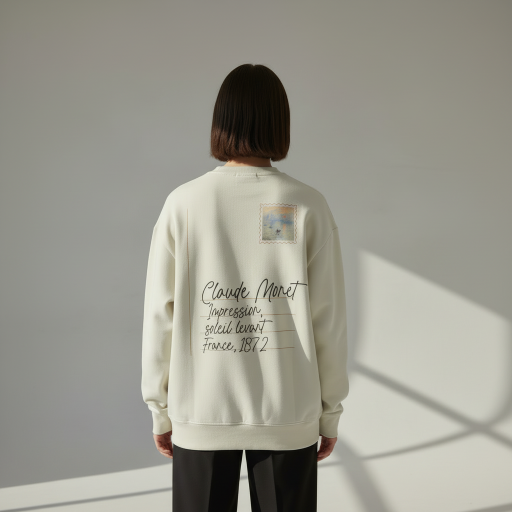 Monet's Impression, Sunrise reimagined as vintage postcards across the back - evoking handwritten memories from the harbor. Cozy cotton-polyester blend delivers warmth without weight, perfect for layering or lounging. Ribbed trim, relaxed fit, built to handle daily life while turning heads.