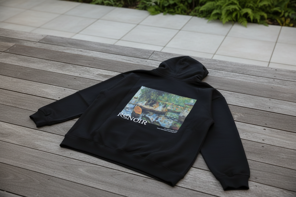 Renoir's La Grenouillère - dancing light on water, Renoir's muse audience in motion, effortless joy - covers the back in striking detail on deep black. Cozy cotton-polyester blend delivers warmth without weight, perfect for layering or lounging. This garment fashions a hood, ribbed cuffs, and is built to handle daily life while turning heads.