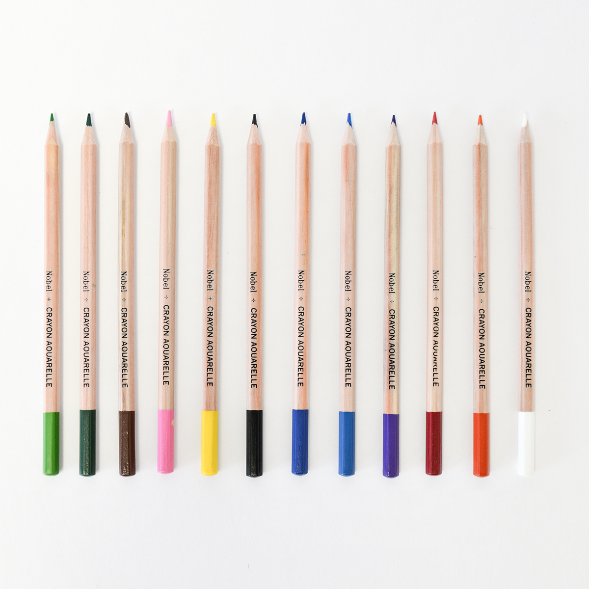 Set of 12 water-soluble pencils: White, Pink, Navy Blue, Sky Blue, Yellow, Green, Mauve, Brown, Red, Lime Green, Black