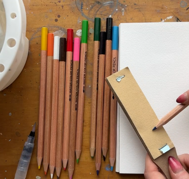 Raser la couleur des crayons avec le bâton de papier de verre inclus dans ce kit produit une poudre qui peut ensuite être appliquée au pinceau sur du papier ou mélangée dans une palette pour produire une couleur ultra saturée qui peut être utilisée pour les lavis et les dégradés.