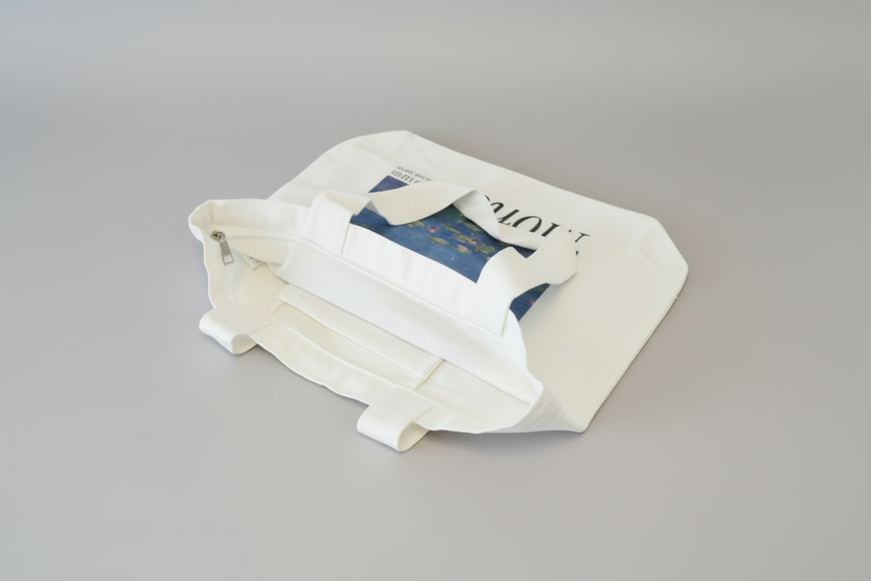 Laissez-vous porter par la sérénité tout au long de la journée. Ce grand cabas en toile blanche (30 x 38 cm) vous accompagne au quotidien avec aisance, tout en attirant les regards grâce à son motif onirique inspiré des « Nymphéas » de Monet : des étangs paisibles et des fleurs flottantes aux couleurs douces et lumineuses. Fermeture éclair sur le dessus pour une sécurité optimale. Robuste, élégant et d'une élégance naturelle.
