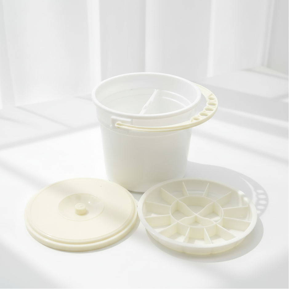 Lave-pinceaux en plastique 750 ml - Comprend un couvercle et un plateau avec 16 compartiments de couleur, 2 compartiments d'eau séparés et 5 emplacements pour pinceaux sur la poignée.